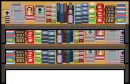 Items on the shelf include what appears to be (from left to right on the top shelf): A Deck of cards, Newspaper, Pornographic magazines, Unknown book (On the cover it appears to be possibly a grill), Mint cans(Possibly), Books, Unknown Objects (appears to be a bottle of some kind), Tissue boxes, Chip cans (Pringle cans), Gum, Chocolate bars and Bags of Chips.